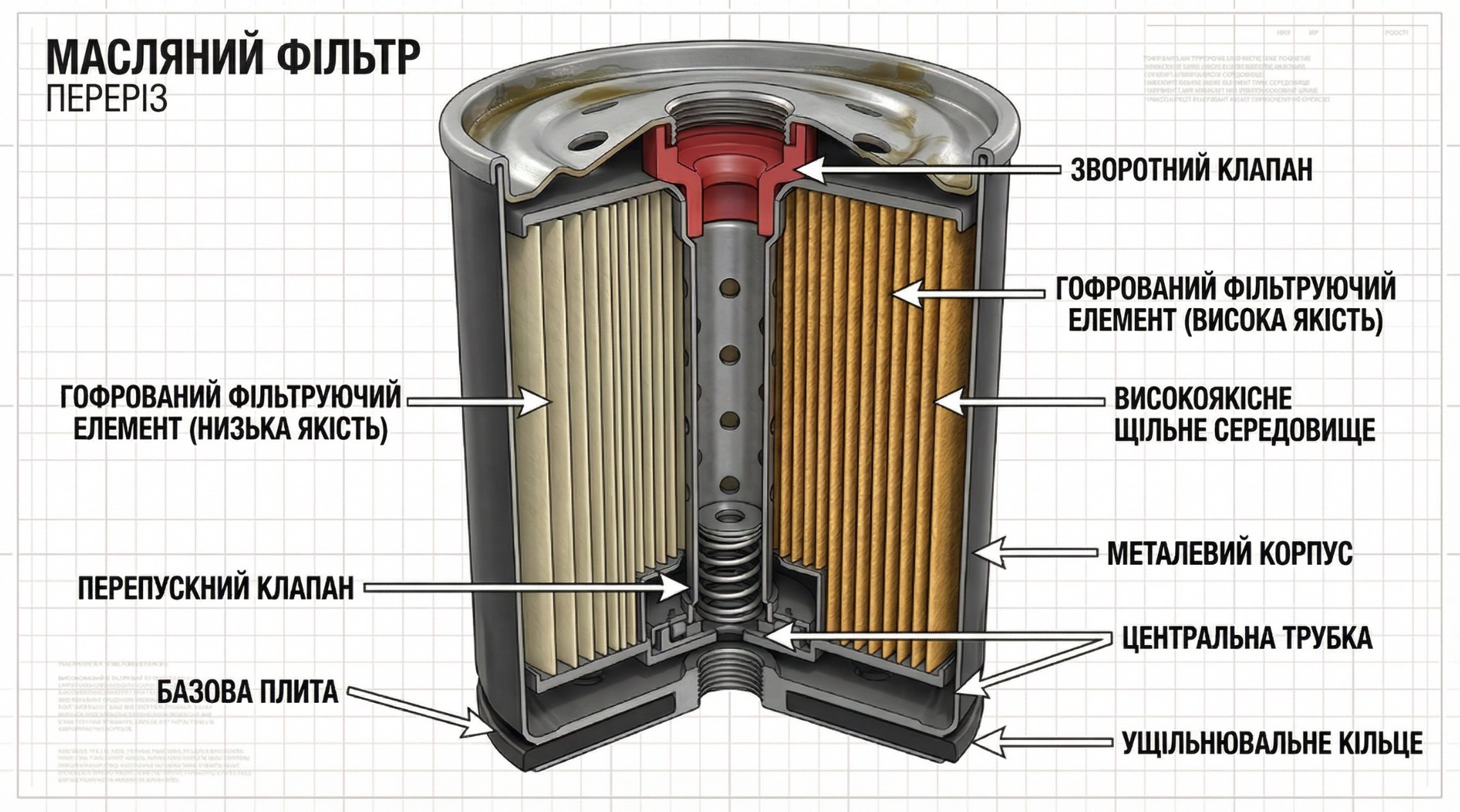 У фільтрі є зворотний клапан. Його задача — не давати оливі стікати в картер, коли мотор заглушений. У дешевих аналогів цей клапан з "дубової" гуми. Він не тримає.