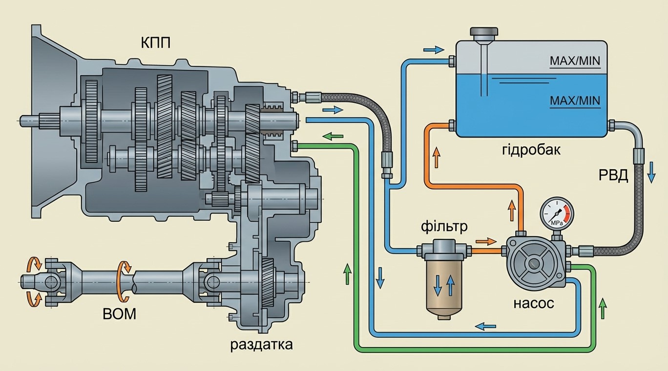 | 50-60 м/год | Двигун | Заміна масла та фільтра | ~5-7 л | ТО-1. Перевірка тиску масла, зазорів клапанів. Підтяжка кріплень. |