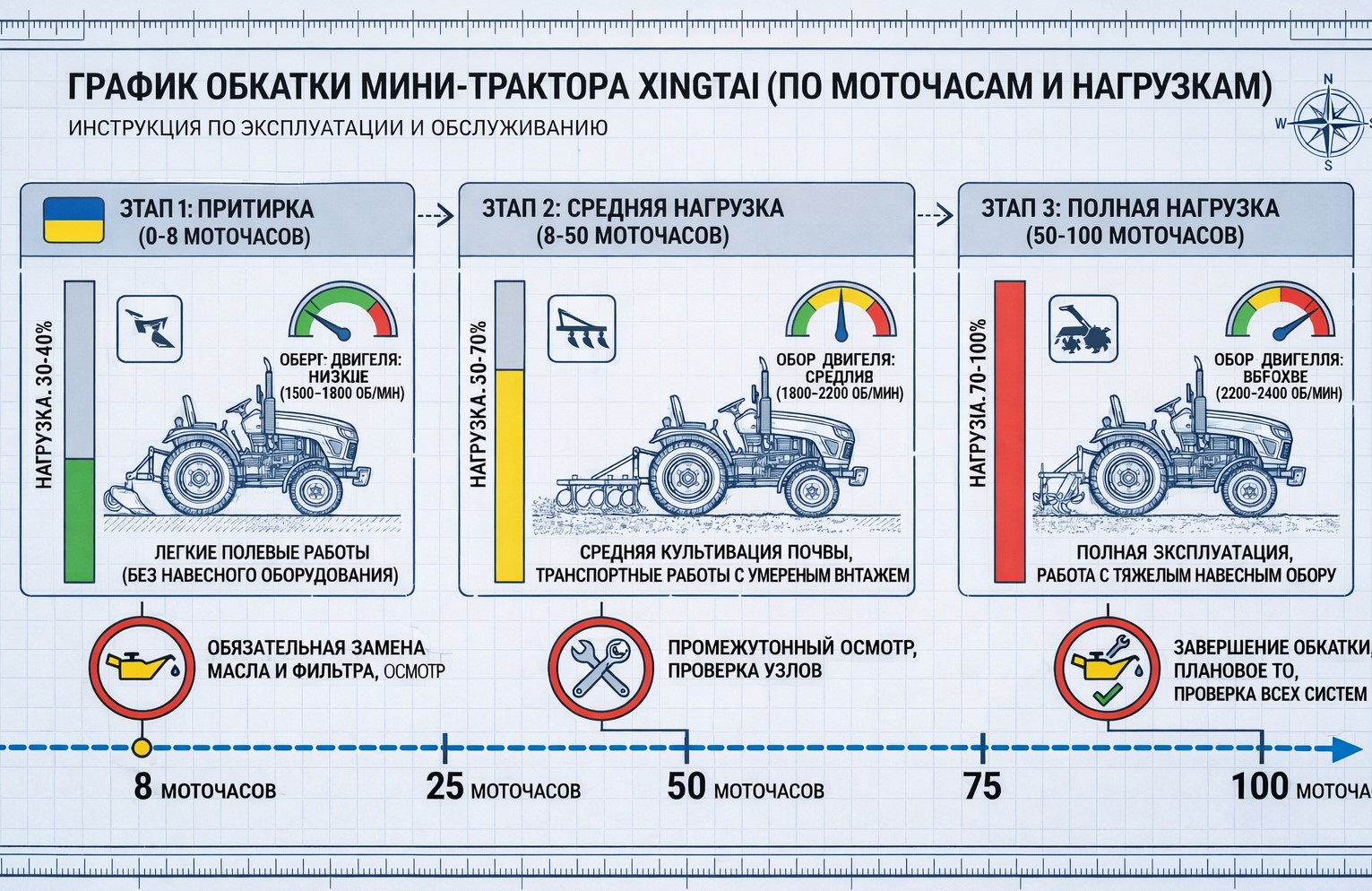 Этап 3 (до 50 мото-часов): Легкие полевые работы. Нагрузка не более 50%. Меняйте режимы работы двигателя. На 50 мото-часах проведите ТО-0: замена масла, фильтров, проверка креплений.